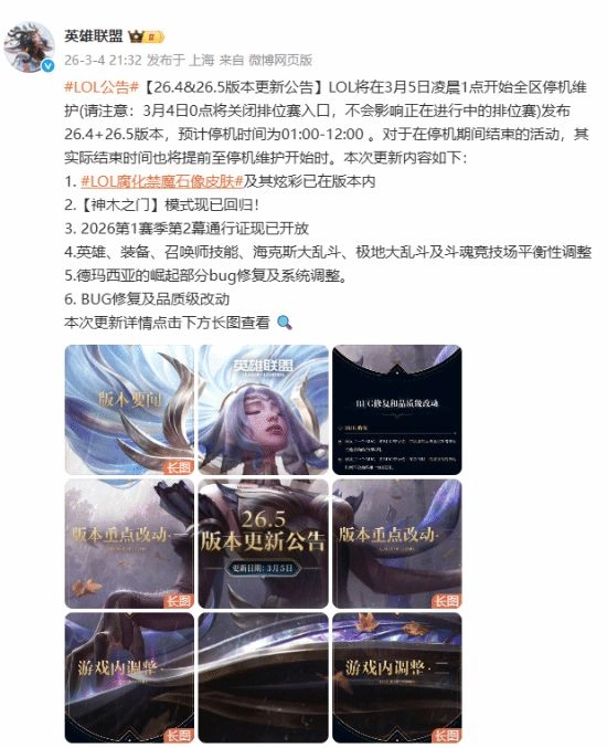 2026年3月4日,英雄联盟官方发布公告,宣布将26.4与26.5版本合并更新;3月5日凌晨1点至12点,全区将进行停机维护,期间会一次性完成两个版本全部内容的更新。