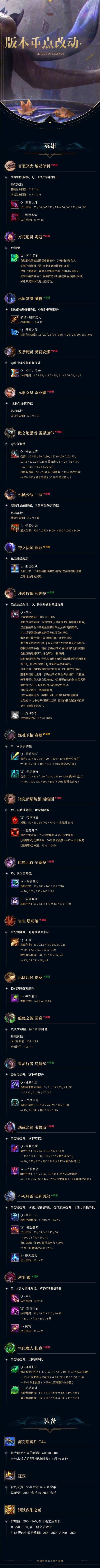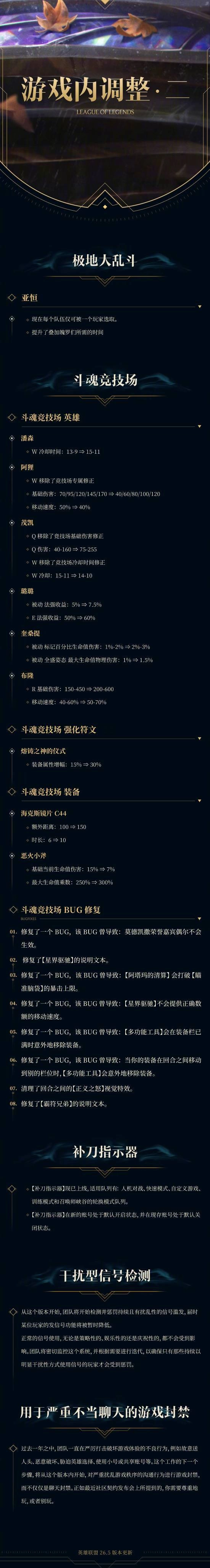 官方对英雄、装备、召唤师技能进行了全面的平衡性调整,同时优化了海克斯大乱斗、极地大乱斗以及斗魂竞技场等玩法模式的平衡设定,还修复了德玛西亚崛起相关的部分游戏bug,以提升整体系统性能与游戏品质。玩家可通过公告长图查看此次更新的完整细节。