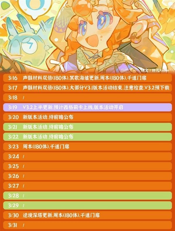 ②V3.2版本仅公布了一位新角色的立绘,推测这大概率会是像2.8那样的小版本,下半段可能会缩短一周,这应该是为周年庆版本做过渡,也恰好能让各位漂泊者稍作休整。要是不打算抽取西格莉卡的话,还可以继续攒资源备战周年庆。