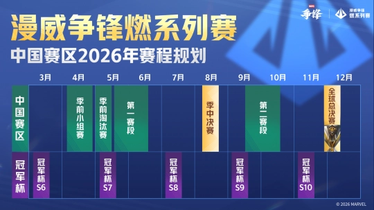《漫威争锋》此前已正式公布燃系列赛2026赛年的整体规划,近日又进一步披露了中国赛区的完整赛程。从赛程图中可以看到,从3月下旬开始,几乎一整年都将有精彩的赛事陆续展开。对于热衷于高强度竞技对抗的玩家而言,今年无疑能过足眼瘾!