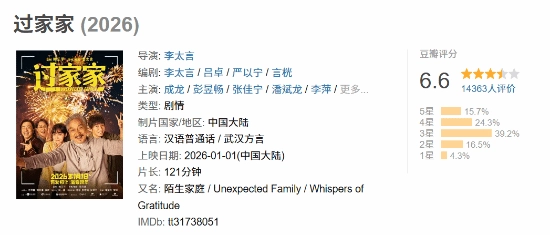 由成龙、彭昱畅、张佳宁担纲主演的电影《过家家》,近日在豆瓣平台正式开启评分。到目前为止,已有超1.4万人参与评价,影片获得了6.6分的成绩。