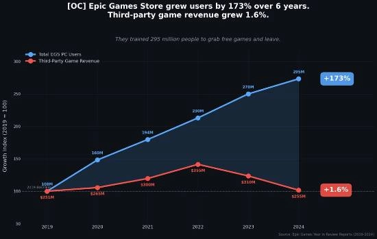 Reddit 用户 HearMeOut-13 整理的一张图表揭示了 EGS 的实际情况。数据表明,从 2019 年开始,EGS 的用户数量出现了 173% 的大幅增长,用户基数从 1.08 亿猛增至 2024 年底的 2.95 亿。