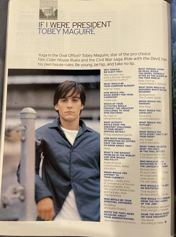 托比·马奎尔曾经被问及这样一个问题:要是他当上总统,会将什么事物合法化?