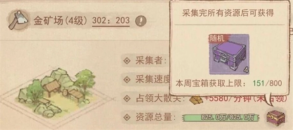 3、最后总结一下,挖金矿和凤凰车秒金矿的积分收益都更高,但铁确实很诱人,在没有积分压力时建议优先挖铁。另外,六级金矿会产出五个宝箱,而六级铁矿仅产出一个!更新后设置了挖宝箱数量上限800,那如何查看当前已挖的数量呢?点击上图中的小宝箱标识,就能清楚看到本周获取的宝箱数量,以便规划后续操作。