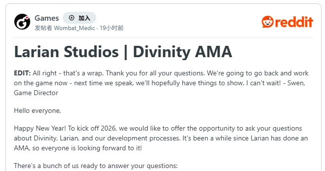 美国当地时间1月9日,拉瑞安工作室在reddit平台开展了一场小型AMA活动,围绕新《神界》进行玩家答疑,CEOSwen Vincke亲临解答玩家关心的问题,并着重说明新作在游戏艺术创作环节未采用AI生成内容。