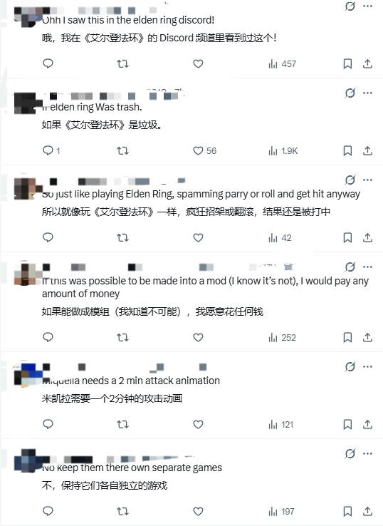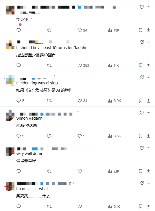 部分玩家在评论区乐不可支,“还好还好,《艾尔登法环》是款动作游戏。”“要是《艾尔登法环》是AI捣鼓出来的次品,估计就和这视频里的样子差不多了。”“这种手忙脚乱招架的狼狈劲儿我可太熟了。”还有些玩家则盼着光与影能针对这款游戏出个模组,好好把它改造一番。