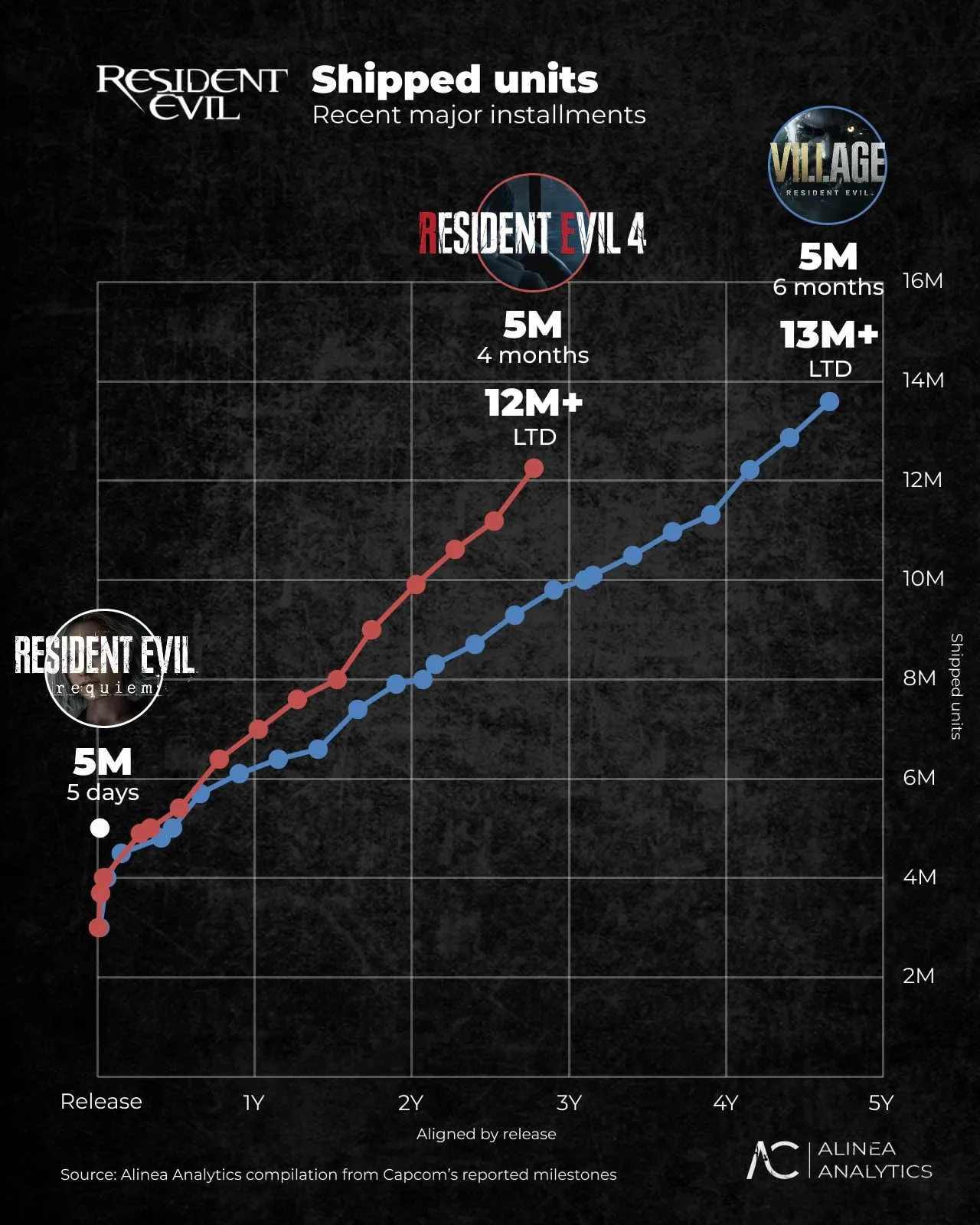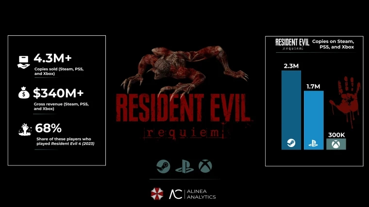 卡普空推出的恐怖新作《生化危机9:安魂曲》取得了出色的成绩,据官方公布的数据,这款游戏在发售首周的全球出货量就超过了500万份。此外,分析机构Alinea Analytics的详细统计还进一步展现了该系列受众结构所发生的变化。