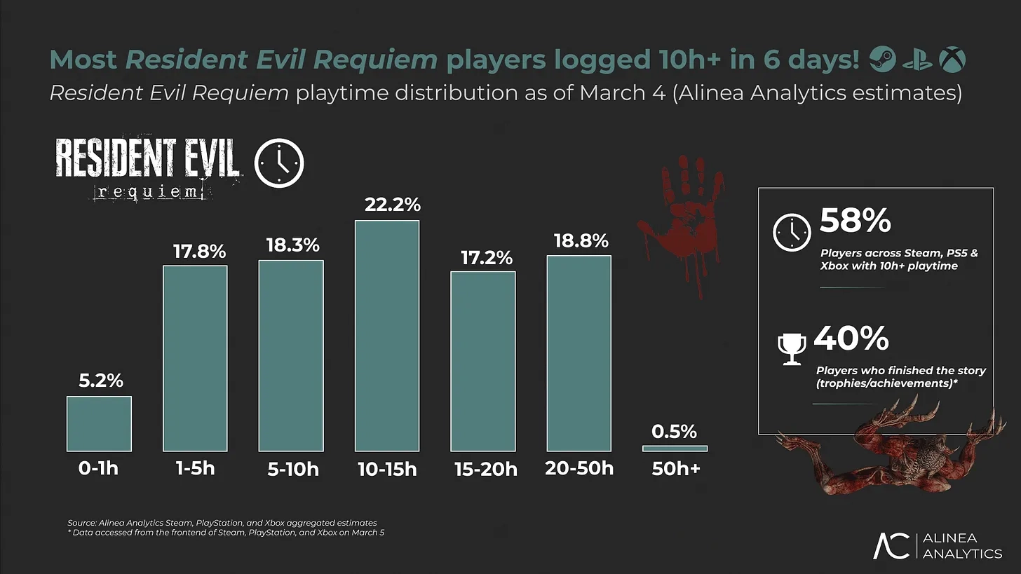分析师认为《生化危机9:安魂曲》的商业成功得益于发行商策略的转变。开发团队并未执着于构建庞大的开放世界,而是专注于提升事件密度——打造了10小时紧凑且内容丰富的战役流程,同时针对Steam Deck等设备进行了出色优化,从而成功吸引了那些更重视个人时间与游戏品质、而非单纯追求游戏时长的成年玩家群体。