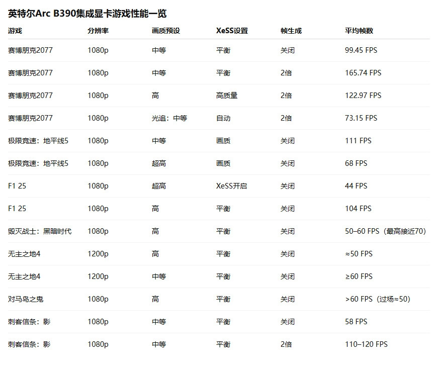 在《刺客信条:影》1080p分辨率、中等画质预设、XeSS设置为平衡模式下,Arc B390集成显卡平均帧数达到58 FPS;开启2倍帧数模式后,帧数稳定在110-120 FPS之间。这款游戏发布时间不长,但对图形性能要求很高;再次证明了Arc B390集成显卡的出色性能。
