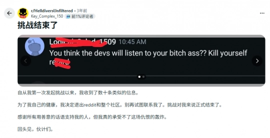 然而,挑战发布后没过多久,发起者就在Reddit上发布了一则更新,称自己收到了大量威胁信息,所以决定退出该社区并终止相关活动。他还提到,受到骚扰的不只是他自己,他的家人以及他参与志愿服务的一家动物救助机构也都收到了骚扰信息。