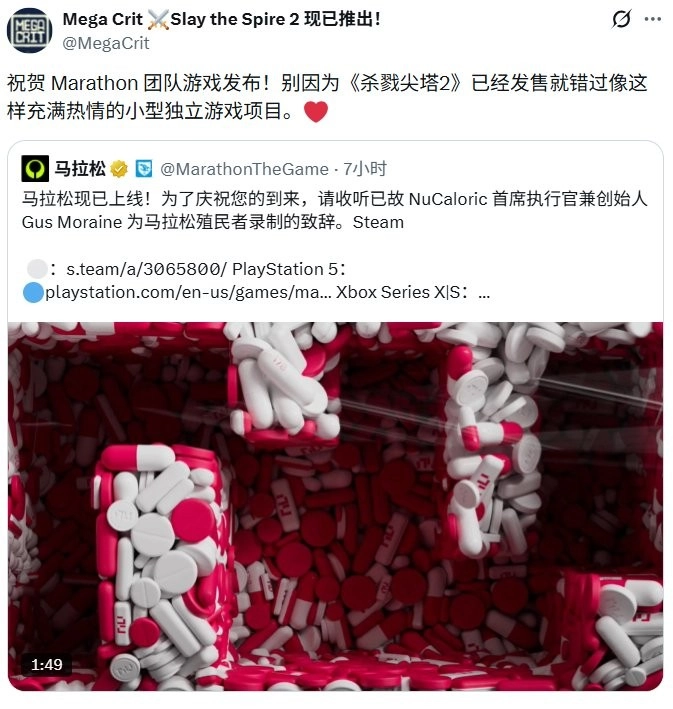 在社交媒体平台上,《杀戮尖塔》的研发团队Mega Crit发布了一条动态。他们先是向《马拉松》漫长等待后终于发售送上祝贺,不过在结尾处,却对这款备受瞩目的大作“补了一刀”。Mega Crit团队称:“可别因为《杀戮尖塔2》已经发售,就忽略了这类用心打造的小众独立游戏项目。”