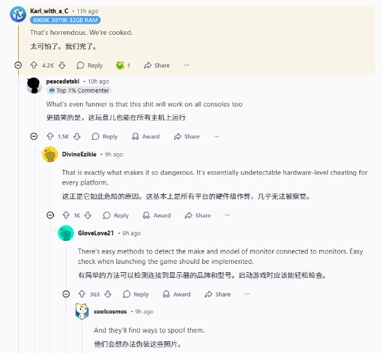 有玩家提议在游戏启动时检测显示器型号来应对相关问题,但也有玩家指出,作弊者可能会通过伪装设备型号来绕过这种检测,甚至开玩笑说需要给显示器引入类似TPM的安全机制。