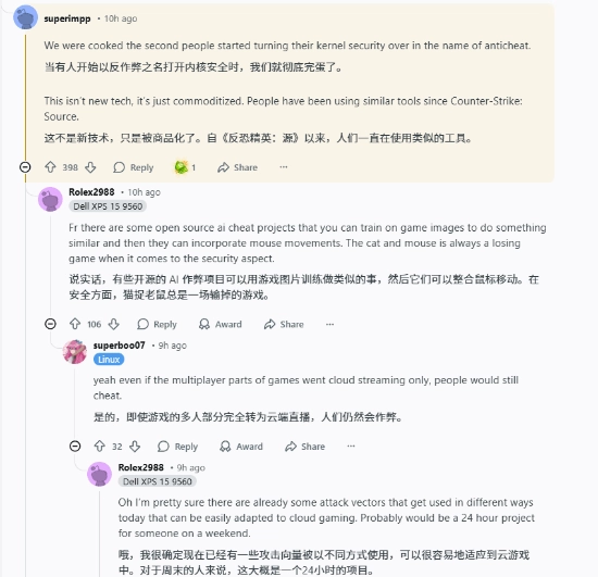 有玩家表示,这类辅助工具并非什么新技术,早在《反恐精英:起源》那会儿就有类似的手段了,而且反作弊和作弊之间的“猫鼠游戏”很难彻底结束,就算是云游戏模式,也说不定会被人找到作弊的漏洞。