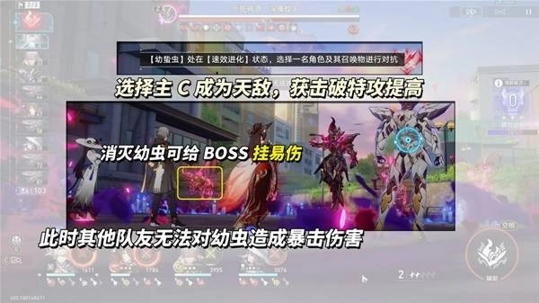 对局中,它会记录部分受击值为侵蚀,后续放技能转为血量。推荐选择扩散、弹射之类的角色,攻击BOSS同时处理幼蛰虫,给BOSS挂易伤。