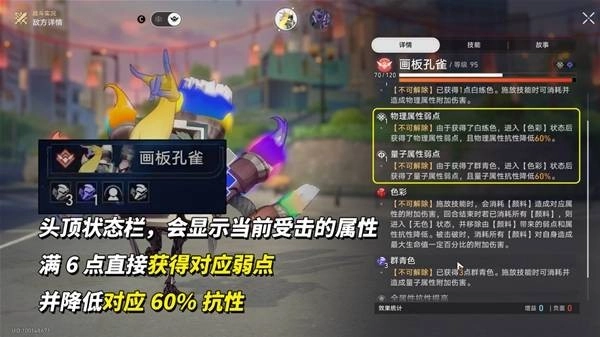 第一波会出现一个新敌人“画板孔雀”,它能够记录自身受到的攻击属性。每次被攻击时,会根据攻击属性积攒1点对应颜料(若受到欢愉伤害则额外积攒2点)。当某一属性颜料积攒到6点时,“画板孔雀”会暴露该属性的弱点,同时自身对应属性的抗性降低60%。在它记录属性的过程中,需要确保持续为其挂上主C的属性。