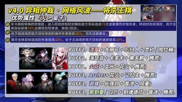 对局【花火大会@Official】,优势属性为「火>量子」,环境异常是“我方受击时会随机出现5%或10%的行动延后效果,我方初始伤害降低40%,每施放1个终结技可移除20%的伤害降低效果”。该对局中存在较多3人环境,扩散型输出在这种情况下优势更为明显。