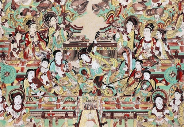 “反弹琵琶”是敦煌壁画里极具标志性的经典形象,常出现在莫高窟飞天主题的作品中。画里的人物一边舒展舞姿,一边把琵琶放在身后反向弹奏,姿态曼妙灵动,彰显出精湛的艺术感染力。这一形象既体现了古代音乐与舞蹈艺术的交融,也成了敦煌艺术的重要标志之一。