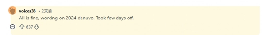 不过,这次似乎是虚惊一场:voices38已在网络上现身,称自己一切安好,只是打算稍作休整。目前这位黑客正致力于研究2024年版的Denuvo加密保护,但尚未透露下一次何时发布,以及会针对哪款游戏。