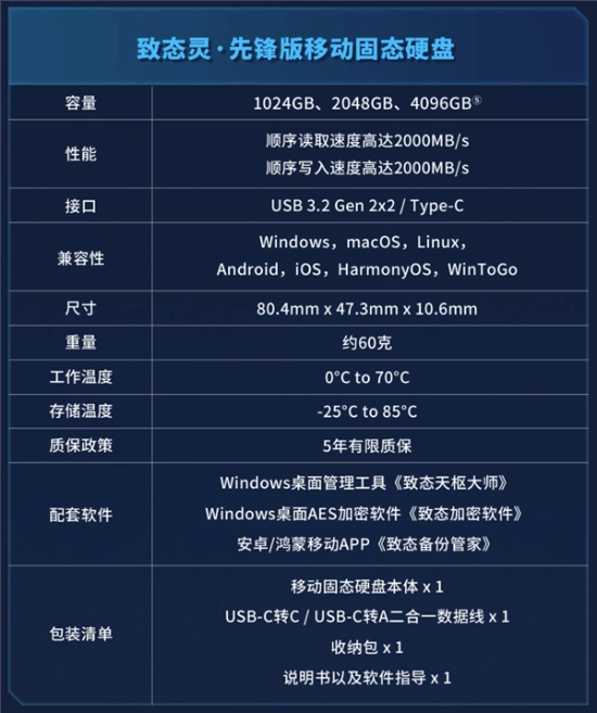系统可全面兼容Windows、macOS、Linux、Android、HarmonyOS等主流操作系统,配套软件包含致态天枢大师、致态加密软件以及致态备份管家。