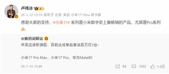 卢伟冰今日转发了相关内容,对大家的支持表达了感谢,他同时着重指出:“小米17系列是小米数字系列历史上销量最高的产品,其中Pro系列的表现尤为突出。”