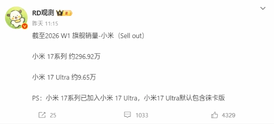 根据博主“RD观测”发布的销量数据,小米17系列(涵盖Ultra及徕卡版)的整体销量已突破300万。