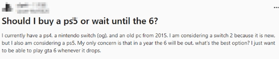 现在,有位玩家在Reddit上发帖子询问:他手头有PS4、第一代Switch和一台2015年的旧电脑,打算买Switch 2,却又在纠结要不要入手PS5。让他拿不定主意的是,PS6可能在一年内就会推出,而他买主机主要就是想玩到《GTA6》。