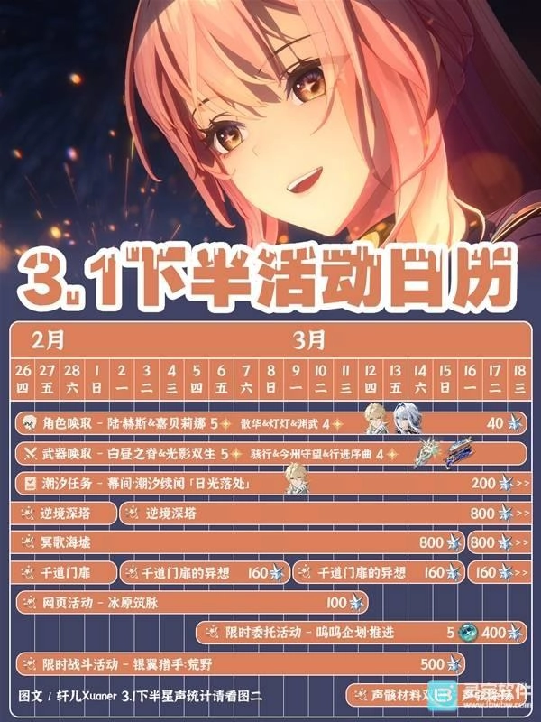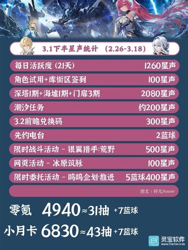 以上就是小编为你整理的“鸣潮3.1下半活动汇总”啦,想要了解更多游戏攻略的话,记得关注灵宝哦!