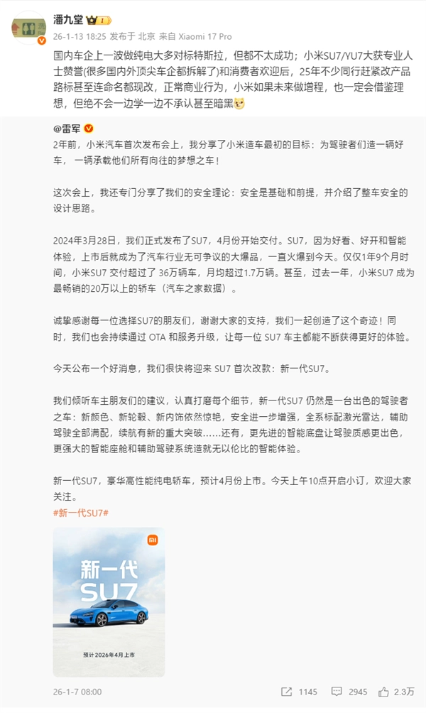 国内车企上一波做纯电车型时,大多以特斯拉为对标对象,但整体成效并不理想。在小米SU7/YU7凭借产品实力收获专业人士高度认可(众多国内外顶尖车企都对其进行了拆解研究),同时也受到消费者广泛欢迎后,2025年不少同行迅速调整产品规划,甚至连车型命名都临时修改,这其实属于正常的商业应对行为。