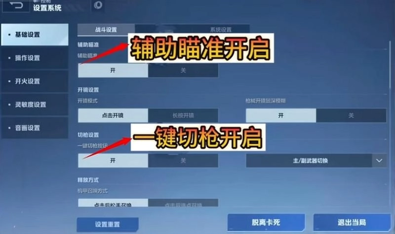 6、建议开启设置中的【辅助瞄准】与【一键切枪】功能,两者配合使用效果会更好。