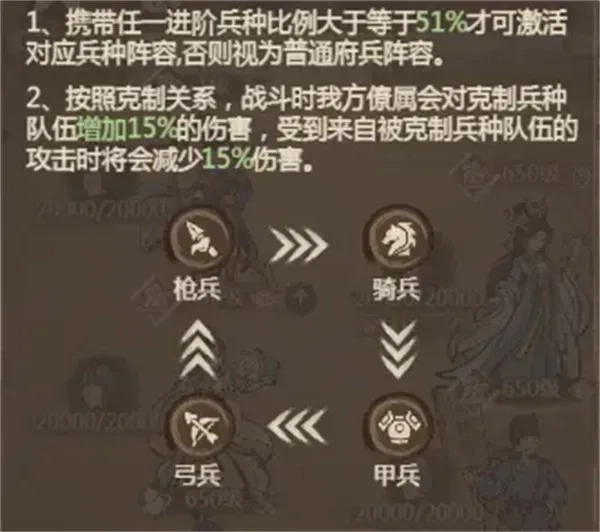 (1)枪兵克制骑兵 枪兵在战斗时面对骑兵会获得伤害加成与防御提升,能够有力限制骑兵的机动性与爆发能力。