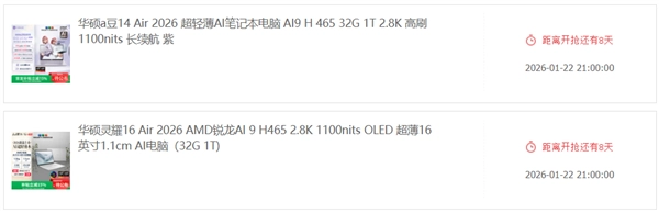 不过华硕在京东平台上架的灵耀16 Air 2026、a豆14 Air 2026等数款搭载锐龙AI 400的笔记本产品页面显示,这些机型计划于1月22日正式开启销售。