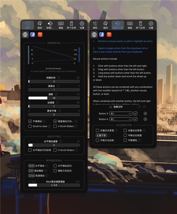 我目前正在使用BetterMouse这款工具,它是付费软件但采用一次性买断的模式。这款工具支持自定义滚动时长、方向以及加速度等参数,同时还兼容MX Master系列鼠标的滚轮缩放、滚动功能和动作绑定,更值得一提的是,它允许针对每个应用单独设置滚动方式和按键映射。