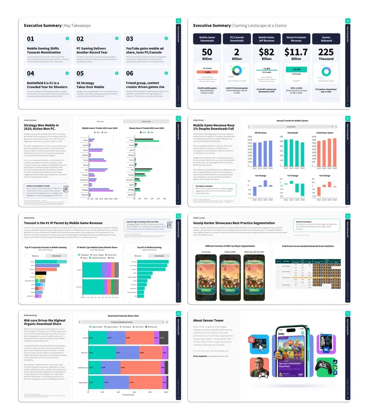近日,数字情报与分析机构Sensor Tower发布《2025年游戏行业现状报告》,梳理出过去一年全球游戏市场的几大关键趋势:移动游戏收入增长态势放缓,仅微涨1%;而PC与主机游戏收入均取得双位数增长,Steam平台的销量更是再创新高。
