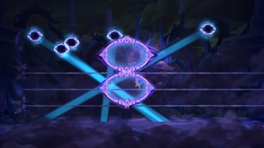 在副本挑战过程中,界面顶部会出现两种不同的标记,分别对应“知识”与“真理”两个维度。当BOSS释放特定攻击时,玩家需要通过快捷键切换这两种标识,以此其攻击机制。另外,BOSS移动时地面会产生震动波,玩家可通过跳跃来规避;同时BOSS还会生成“注视空间”,并沿其轨道俯冲,对范围内的玩家造成高额伤害。