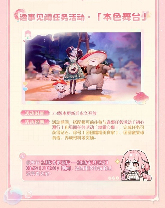 活动期间,搭配师可以参与逸事任务活动「初心漫行」和见闻任务活动「糖霜心事」,完成任务后能获得钻石、【团团糯糯美食家】称号、团圆蜜果球食谱以及养成材料等奖励。