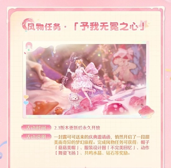 露可可送来的一封庆典邀请函,悄然开启了一段甜美又奇异的梦幻旅程。完成风物任务,就能获得帽子「菇菇美帽」、服装设计图「不完美回忆」、动作【舞姿飞扬】,以及共鸣水晶、钻石等奖励。