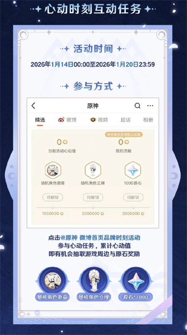 心动时刻互动任务的时间安排在2026年1月14日00:00至1月20日23:59。
