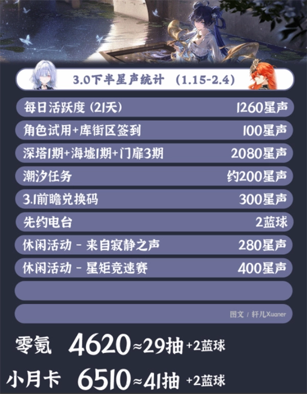 小月卡或大月卡玩家:大约可获得6510星声