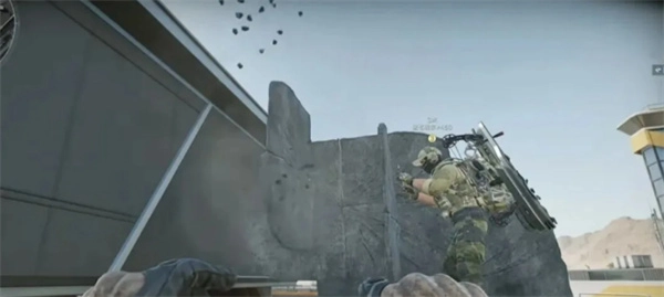 3、第三步:盾√移动到上图中紧贴水泥墙的位置时,需要断开网络,接着通过疾跑加跳跃的方式翻越水泥墙;与此同时,乌鲁鲁搭建最后一块水泥墙,等盾√重新连接网络后,就能爬上房顶了(学会了吗?要是还没掌握,多尝试几次肯定能成功的)。