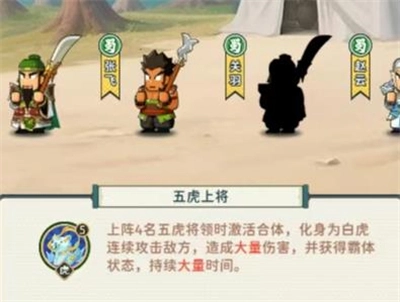 2、常规五虎队:关羽、张飞、黄忠、马超、赵云。这套合体技阵容相对固定,主要是结合连击机制来搭配——比如张飞的技能可实现“倒地→击退”,黄忠能衔接“击退→击飞”,赵云则可完成“击飞→倒地”的小循环;后续只需根据武将和武器的星级情况,优先安排高星的上阵即可。