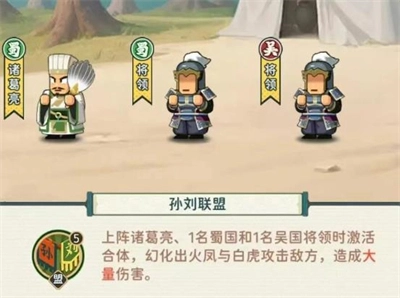 4、孙刘联盟:当阵容中同时上阵诸葛亮、1名蜀国武将和1名吴国武将时即可激活该效果。蜀国武将的选择上,前期赛季可以优先考虑刘备,后期则更适合选用姜维——不过姜维要到较晚的赛季才会解锁开放。而吴国武将的选择,大部分情况下都会倾向于大乔:大乔与诸葛亮搭配能形成双重回血效果,还具备复活队友的能力,这大大提升了队伍的容错率,有效避免关键武将过早减员;此外,大乔的大招还能在队伍连击体系中衔接击飞与击退效果,而刘备的技能刚好可以承接这一击退状态,形成流畅的技能联动。