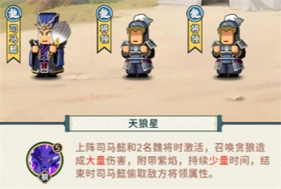 3、魏国天狼星:当司马懿与2名魏将同时上阵时激活。若你已拥有高星曹操和高星司马懿,可将二者搭配开启天狼星效果,再辅以邓艾、曹仁、荀彧为最佳组合——这套阵容兼具防御与输出能力,回怒速度也十分出色。