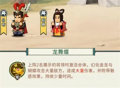 5、龙舞蝶:激活条件为上阵吕布与貂蝉,这套阵容通常要等吕布和貂蝉均达到9星及以上,才能具备较强的实战强度。该合体技阵容的搭配方式较为灵活,组队思路一般优先选择连击次数多的组合,或是其他队伍中星级更高的名将。