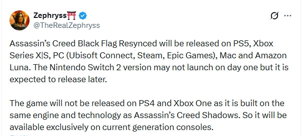 《刺客信条》系列的知名爆料者@TheRealZephryss(玩家常称其为“舅舅”)通过推文透露,《刺客信条4:黑旗重制版》计划登陆PC平台(涵盖Ubisoft Connect、Steam、Epic Games商店)、PS5、Xbox Series X|S、Mac以及亚马逊云游戏平台Luna。不过该作首发阶段暂不登陆Switch 2,后续会推进向Switch 2的移植工作。