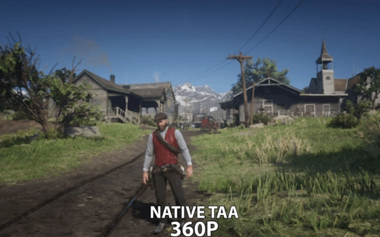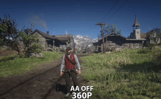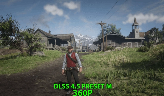博主还分享了《荒野大镖客:救赎2》的对比图片:第一张图是游戏以360p内部渲染分辨率运行,再通过最新的DLSS 4.5(预设M档)升频至720p的效果;第二张图同样基于360p内部渲染分辨率,不过采用原生TAA(时间抗锯齿)技术升级到720p;第三张图则是关闭抗锯齿状态下的对比画面。