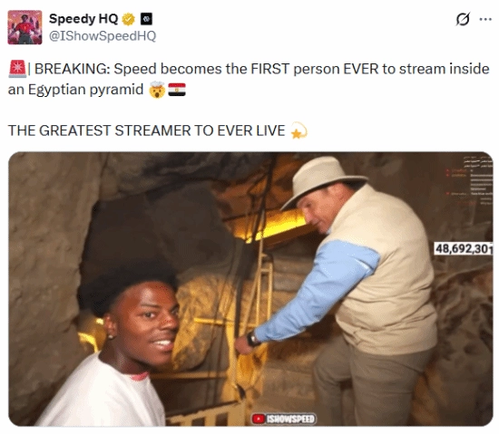 近日,知名全球网红甲亢哥(speedy)又有新动作,开启了直播探险金字塔的挑战。