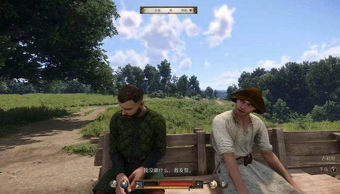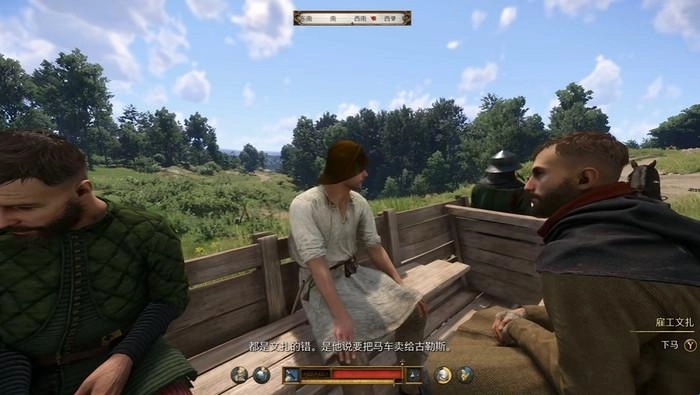 4、接下来,亨利便会与其他NPC一同坐在马车上,复刻《上古卷轴5:天际》开头四人同乘马车的经典名场面。