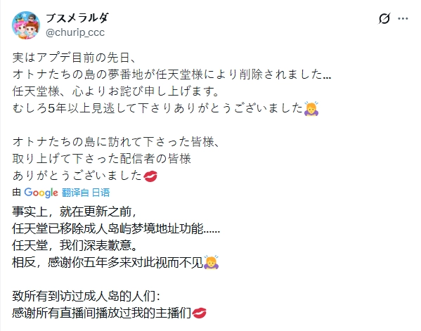 令人意外的是,这座岛屿的创作者对于此次删除操作并未流露出不满情绪,反而通过社交媒体向任天堂公开表达了歉意与谢意。他表示:“其实,就在游戏更新的前一天,‘成人岛’对应的梦境地址已经被任天堂移除了。我要向任天堂致以最诚挚的歉意。同时,更要感谢他们在过去五年多时间里一直以来的‘宽容’。另外,也由衷感谢每一位曾经到访过这座岛屿的玩家,还有那些在视频中对它进行过展示的主播们。”