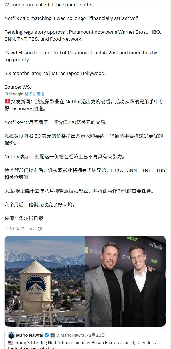 去年12月,Netflix曾以720亿美元的出价战胜派拉蒙,顺利达成对华纳兄弟探索频道的收购。而埃里森所拥有的派拉蒙天空之舞影业在之后提交了一份经过调整的报价,该报价于周四被判定为“更具优势的方案”。