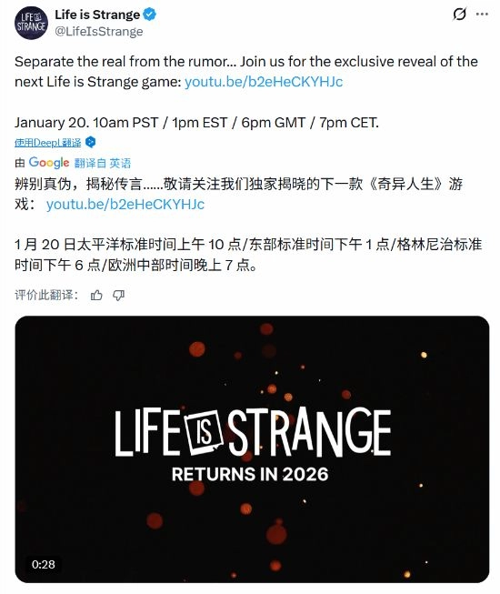 游戏的全称为《奇异人生:重聚》,目前已通过相关游戏内容评级。制作方宣布,将于北京时间1月21日凌晨2点正式公布这款游戏的详细信息,其中涵盖具体的发售日期以及登陆平台等内容。